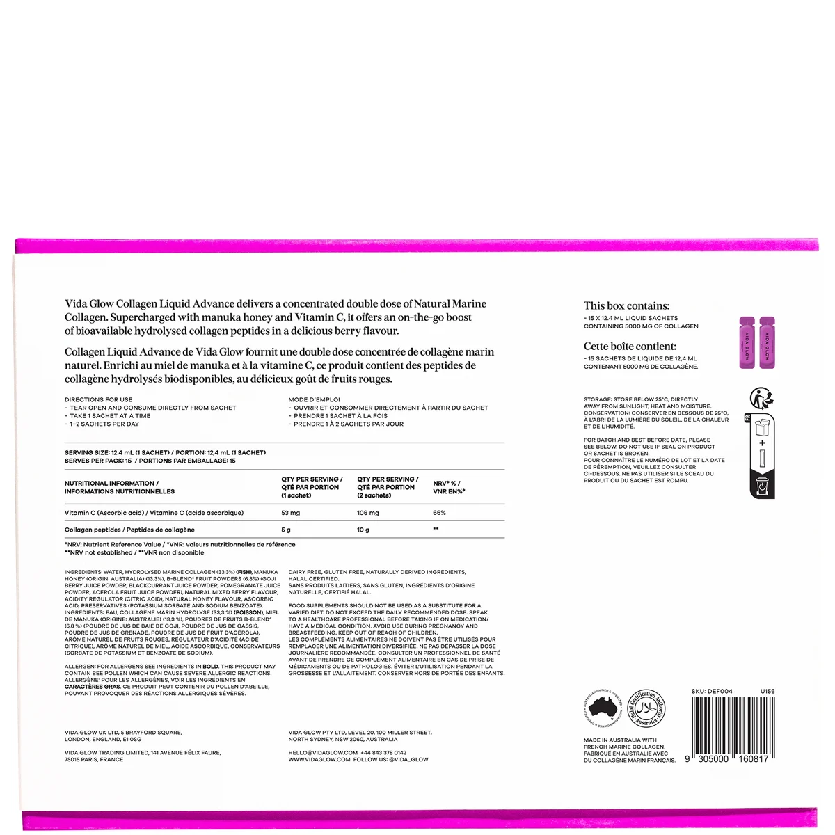 Состав: Water, Hydrolysed Marine Collagen (33.3%) (Contains Fish), Manuka Honey (Origin: Australia) (13.3%), B-blend4 Fruit Powders (6.8%) (Goji Berry Juice Powder, Blackcurrant Juice Powder, Pomegranate Juice Powder, Acerola Fruit Juice Powder), Natural Mixed Berry Flavour, Acidity Regulator (Citric Acid), Natural Honey Flavour, Ascorbic Acid, Preservatives (Potassium Sorbate And Sodium Benzoate).
