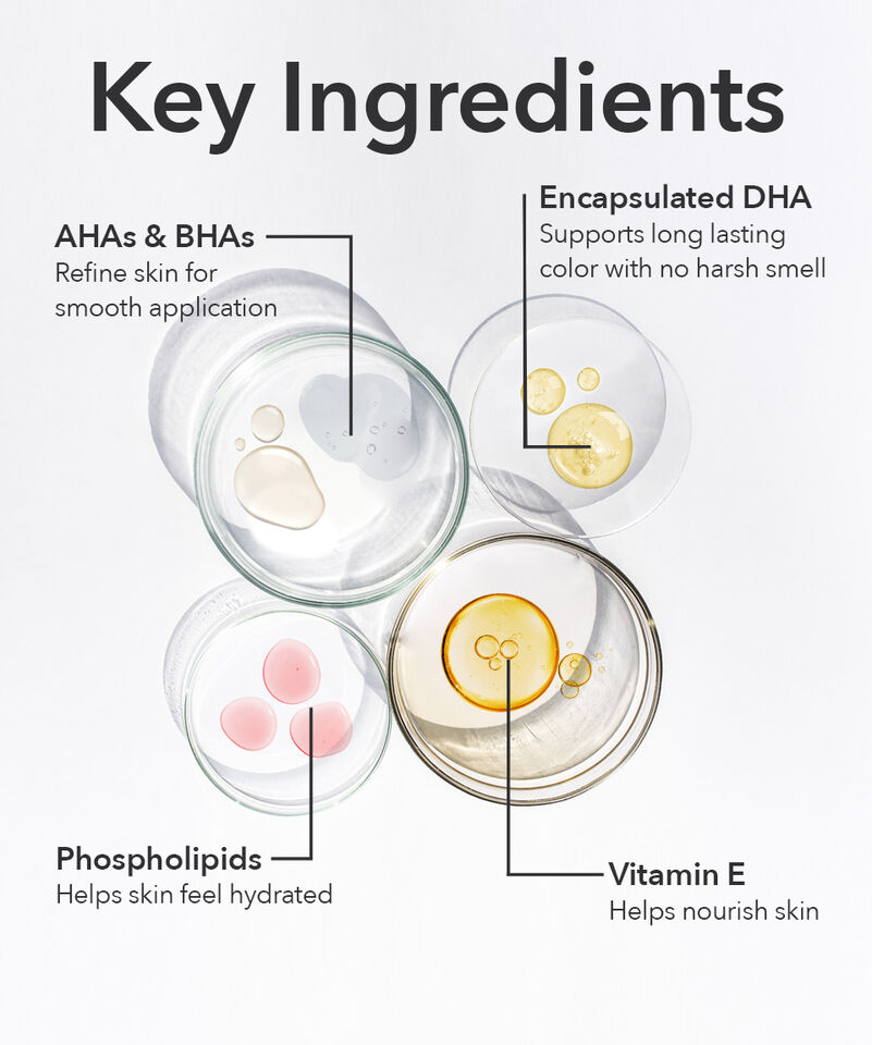 Water, Propanediol, Glycerin, Ethoxydiglycol, Dihydroxyacetone, Glycolic Acid, Lactic Acid, Salix Alba (Willow) Bark Extract, Ascorbic Acid, Ascorbyl Palmitate, Tocopheryl Acetate, Panthenol, Sodium Hyaluronate, Phyllanthus Emblica Fruit Extract, Retinyl Palmitate, Leuconostoc/Radish Root Ferment Filtrate, Hydrolyzed Soy Protein, Hydroxylated Lecithin, Phospholipids, Phytic Acid, Citric Acid, Disodium EDTA, Acrylates/Carbamate Copolymer, Butylated PVP, Erythrulose, Polysorbate 80, Phenoxyethanol, Potassium Sorbate, Sodium Benzoate.